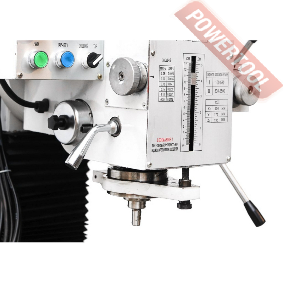 - Операции сверления и фрезерования могут выполняться двумя способами: в ручном режиме (быстрая подача при сверлении) и работа с червячным механизмом (медленная подача при фрезеровании).
