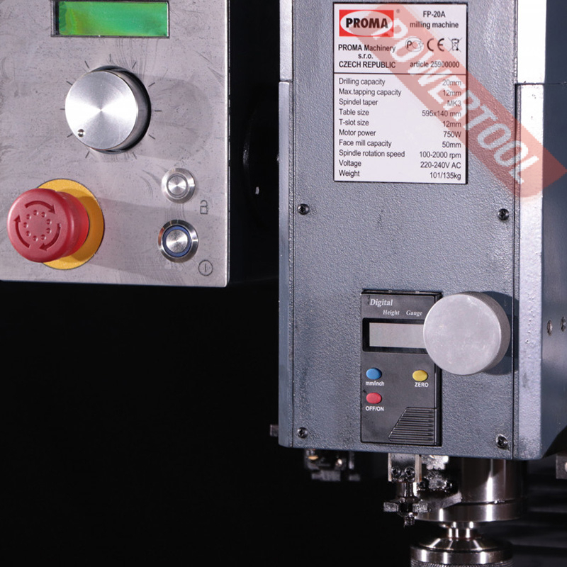 Сверлильно фрезерный станок по металлу PROMA FP-20A представляет собой компактную конструкцию для обрабатывания небольших деталей. Среди возможностей агрегата - концевое и торцевое фрезерование, сверление отверстий диаметром до 20 мм, нарезание резьбы размером до М12. Питание станка осуществляется от однофазной сети. Для визуального контроля параметров работы на пульте управления есть цифровой дисплей. Крупные рукояти способствуют удобству эксплуатации оборудования. Для точности в работе на край стола нанесена миллиметровая разметка.