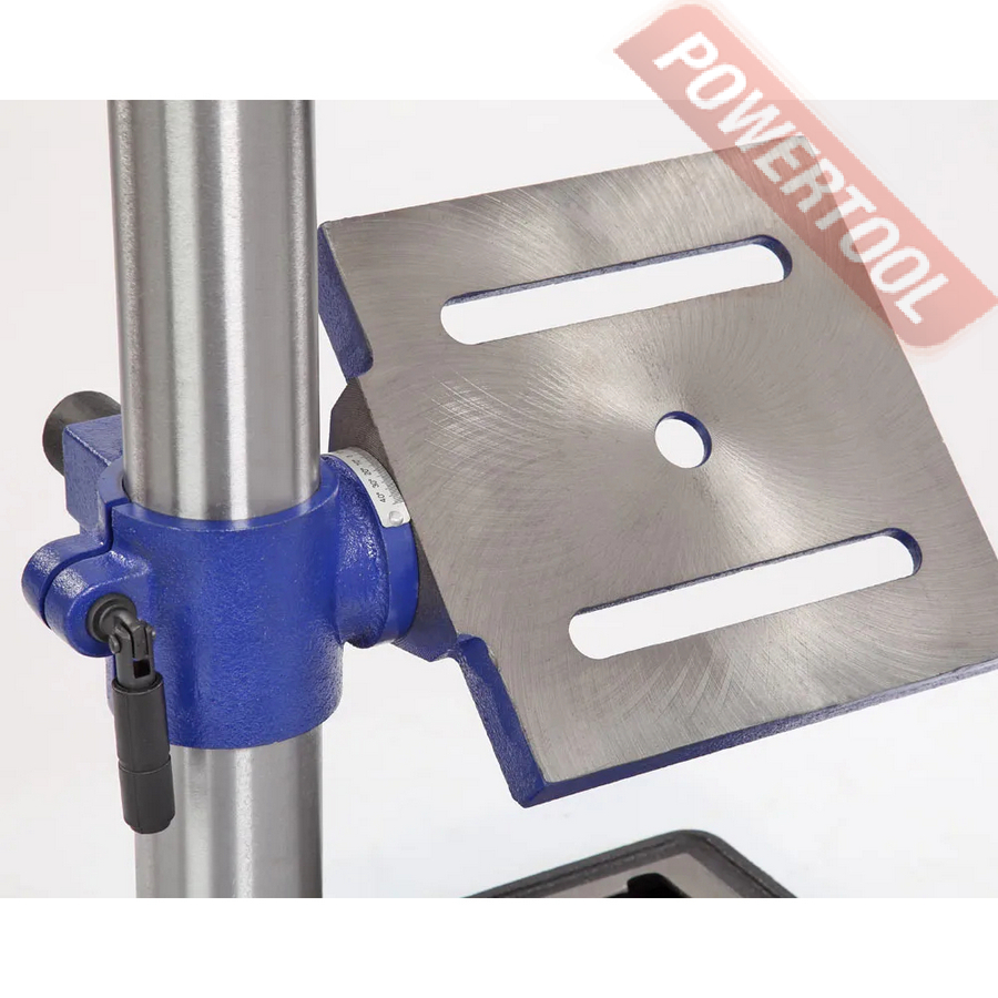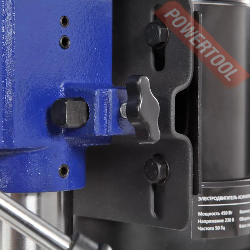 В комплекте предусмотрены тиски. Для их крепления есть по два паза на рабочем столе и на основании. Шкала, расположенная на рукоятке регулировки глубины сверления, показывает ход пиноли шпинделя, с ее помощью можно настраивать ход пиноли, для этого необходимо провернуть шкалу, стрелка на корпусе будет показывать значение, на которое будет возможно погружение сверла, затем затянуть барашек. Наконечники тройной рукояти удобной формы, что способствует плавной подаче сверла к заготовке.