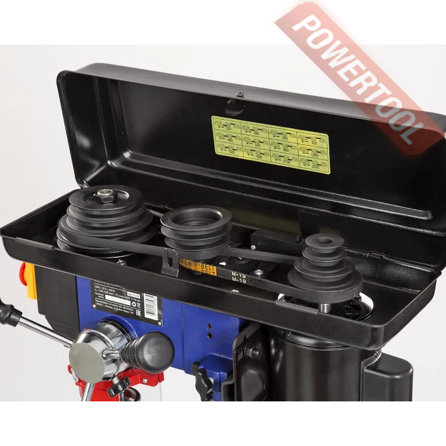 Имеется двенадцать ступеней скорости вращения шпинделя, что необходимо при выполнении различных операций и типах материала. Переключение производится за счет переброски ремней. Для этого необходимо открыть крышку ременного отсека, ослабить барашек крепления двигателя, тем самым получив возможность смещения шкива, перекинуть ремень и проделать операцию в обратной последовательности.