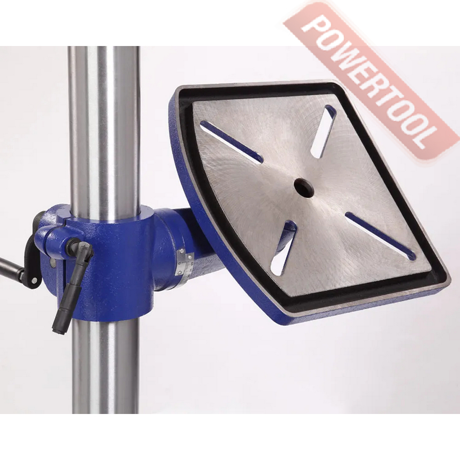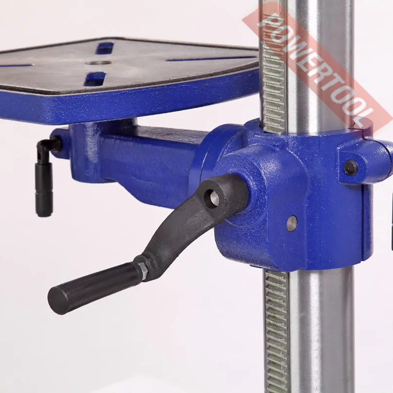В комплекте предусмотрены тиски. Для их крепления есть четыре паза на рабочем столе и два на основании. Шкала, расположенная на рукоятке регулировки глубины сверления, показывает ход пиноли шпинделя, с ее помощью можно настраивать ход пиноли, для этого необходимо провернуть шкалу, стрелка на корпусе будет показывать значение, на которое будет возможно погружение сверла, затем затянуть барашек. Наконечники тройной рукояти удобной формы, что способствует плавной подаче сверла к заготовке. Для точного позиционирования станок оснащен лазером - указателем.