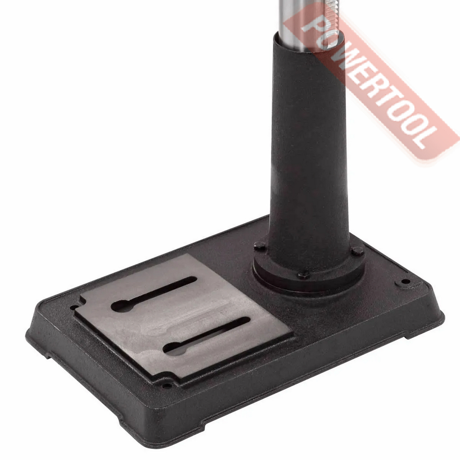 Заготовку можно крепить как к рабочему столу, так и к основанию, все зависит от ее размера. В комплекте предусмотрены тиски. Для их крепления есть два Т-образных паза на рабочем столе и два паза на основании. Основание станка массивное, что обеспечивает устойчивость, хотя для дополнительной фиксации есть четыре отверстия. Для точного позиционирования режущего инструмента станок оснащен лазером-указателем. Кроме него работу облегчит подсветка рабочей зоны. Ход пиноли составляет 80 мм. Наконечники тройной рукояти удобной формы, что способствует плавной подаче сверла к заготовке.