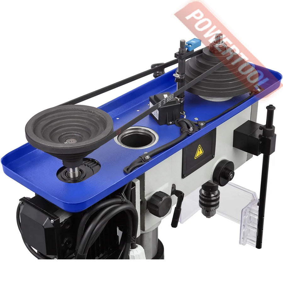 Сверлильный станок, 1100 Вт, 380 В, max диаметр сверления 32 мм, max нарезаемая резьба M16, частота вращения шпинделя 200-2250 об/мин, 5 скоростей, ступенчатая регулировка оборотов, конус шпинделя КМ-3, посадочное сверлильного патрона B16, диапазон хвостовиков для патрона 1-16 мм, ход пиноли шпинделя 135 мм, вылет шпинделя 245 мм, шпиндель-стол 855 мм, шпиндель-основание 1200 мм, диаметр стойки 98 мм, размер основания 650х440 мм, размер стола 380х410 мм, 2 Т-образных паза, подсветка рабочей зоны, лазерный целеуказатель, габариты ДхШхВ 840х730х1750 мм, вес 207 кг, в комплекте патрон ключевой В16 1-16 мм, оправка КМ-3/В16, защитный экран, набор инструментов, тиски.