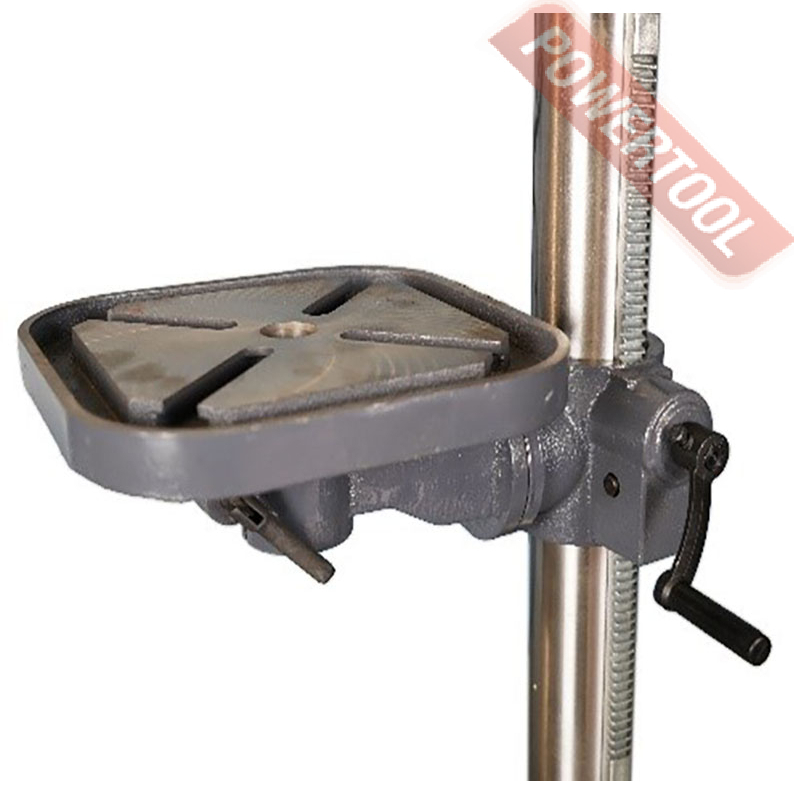 Станок оснащен мощным и надежным асинхронным двигателем с медной обмоткой мощностью 900 Вт. Сверлильный стол имеет возможность поворота на 45 градусов в обе стороны по вертикали для обработки отверстий под углом. Стол оснащен пазами для крепления заготовок и оснастки. Контроль угла поворота сверлильного стола осуществляется по шкале угломера. Модель дополнительно оснащен возможностью вращения стола на 360 градусов по горизонтали.