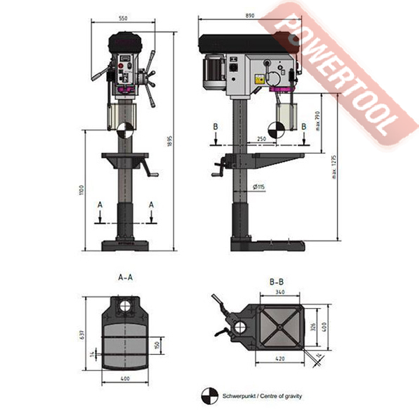Сверлильный станок, 2200 Вт, 380 В, max диаметр сверления 40 мм, max нарезаемая резьба M12, частота вращения шпинделя 150-2000 об/мин, 2 скорости, бесступенчатая регулировка оборотов, индикация числа оборотов, конус шпинделя КМ-4, посадочное сверлильного патрона B16, диапазон хвостовиков для патрона 1-16 мм, ход пиноли шпинделя 160 мм, вылет шпинделя 285 мм, шпиндель-стол 790 мм, шпиндель-основание 1275 мм, диаметр стойки 115 мм, размер основания 637х400 мм, размер стола 420х400 мм, угол поворота стола 360 градусов, 2 Т-образных паза 14 мм, подсветка рабочей зоны, габариты 920х585х1895 мм, вес 275 кг, в комплекте патрон быстрозажимной В16 1-16 мм, оправка КМ-4/B16, защитный экран.
