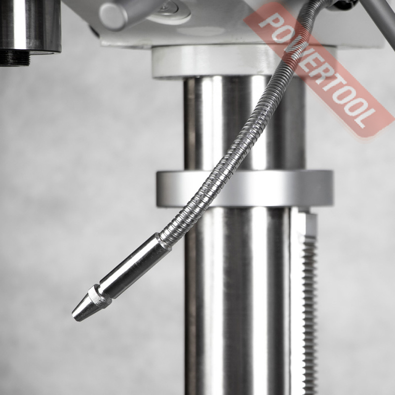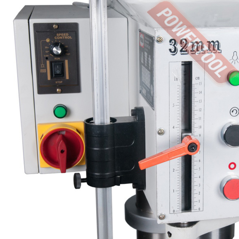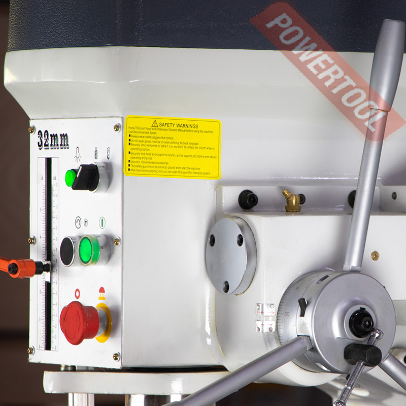 Сверлильный станок, 1500 Вт, 380 В, max диаметр сверления 32 мм, max нарезаемая резьба M20, частота вращения шпинделя 125-1975 об/мин, 8 передач, бесступенчатая регулировка оборотов, автоподача пиноли, конус шпинделя КМ-3, посадочное сверлильного патрона JT3, диапазон хвостовиков для патрона 5-20 мм, ход пиноли шпинделя 150 мм, вылет шпинделя 265 мм, шпиндель-стол 820 мм, шпиндель-основание 1235 мм, диаметр стойки 100 мм, размер основания 380х310 мм, размер стола 380х400 мм, 4 Т-образных паза 16 мм, подсветка рабочей зоны, габариты 900х600х1855 мм, вес 260 кг, в комплекте патрон JT3 5-20 мм, оправка КМ-3/JT3, защитный экран, набор инструментов, система СОЖ.