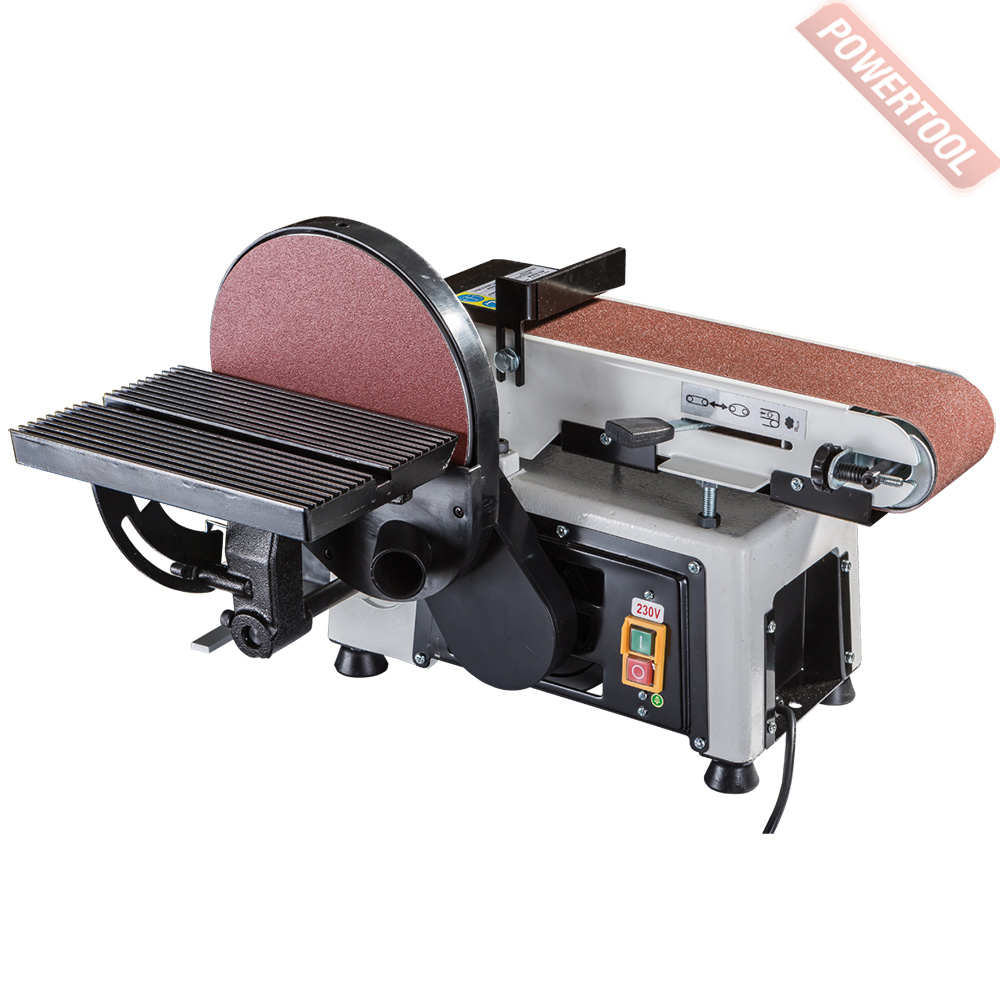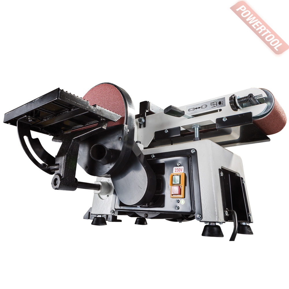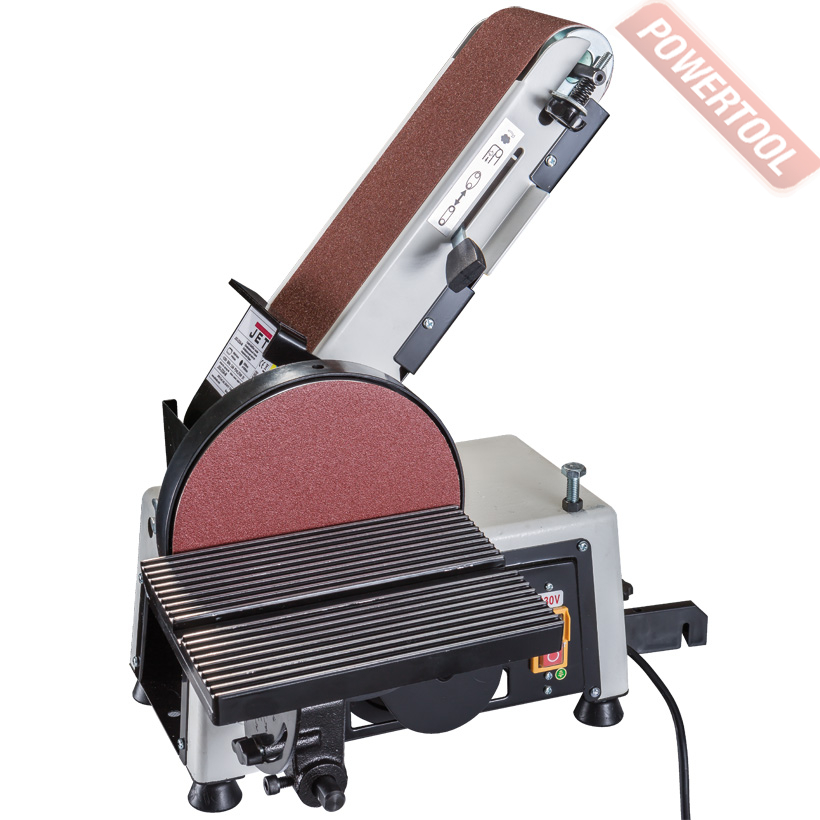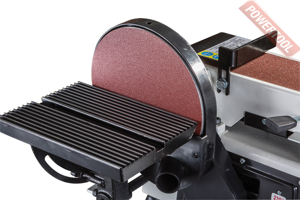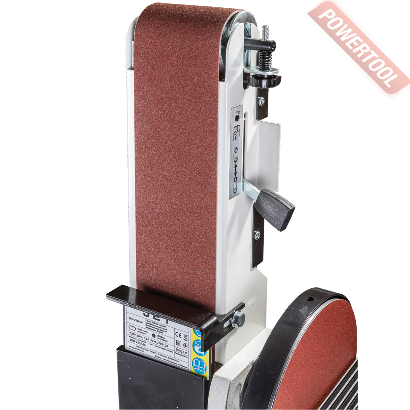 Тарельчато-ленточный шлифовальный станок JSG-233A-M для профессионального применения в частных столярных мастерских. Это относительно компактная модель, предназначенная для настольного размещения, но сделанная точно и основательно. Корпус выполнен литым из чугуна, что повышает устойчивость и способствует снижению вибраций при работе. Рабочий стол из алюминиевого литья и установлен на мощном поворотном кронштейне с дополнительной опорой, увеличивающей жесткость. В зависимости от необходимости его монтируют напротив тарельчатого или ленточного шлифовального узла.