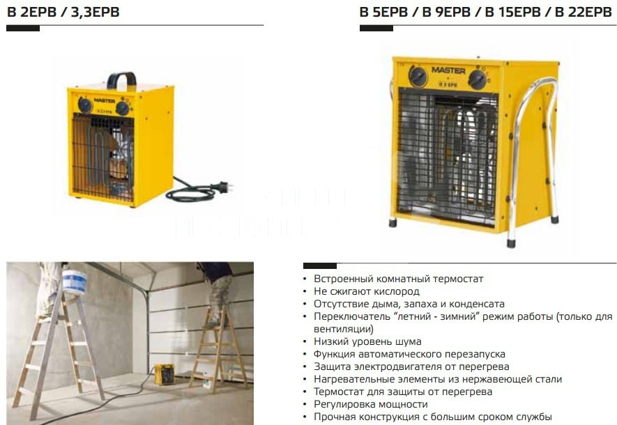 - Функция вентилятора. Аппарат способен работать как обычный вентилятор, создавая мощный направленный поток. Это позволяет использовать электрическую тепловую пушку MASTER даже летом.