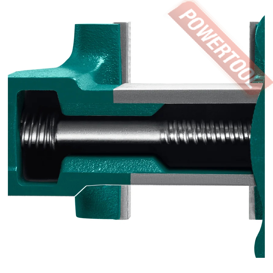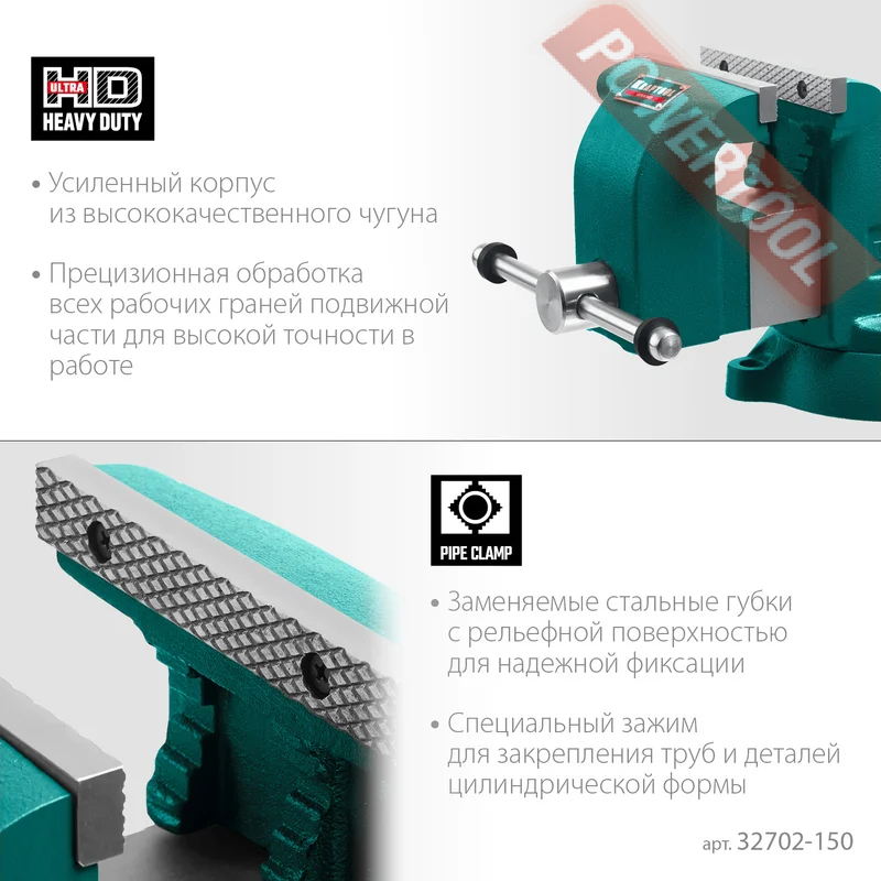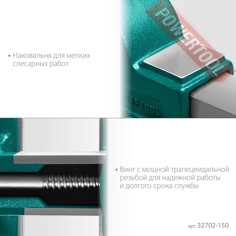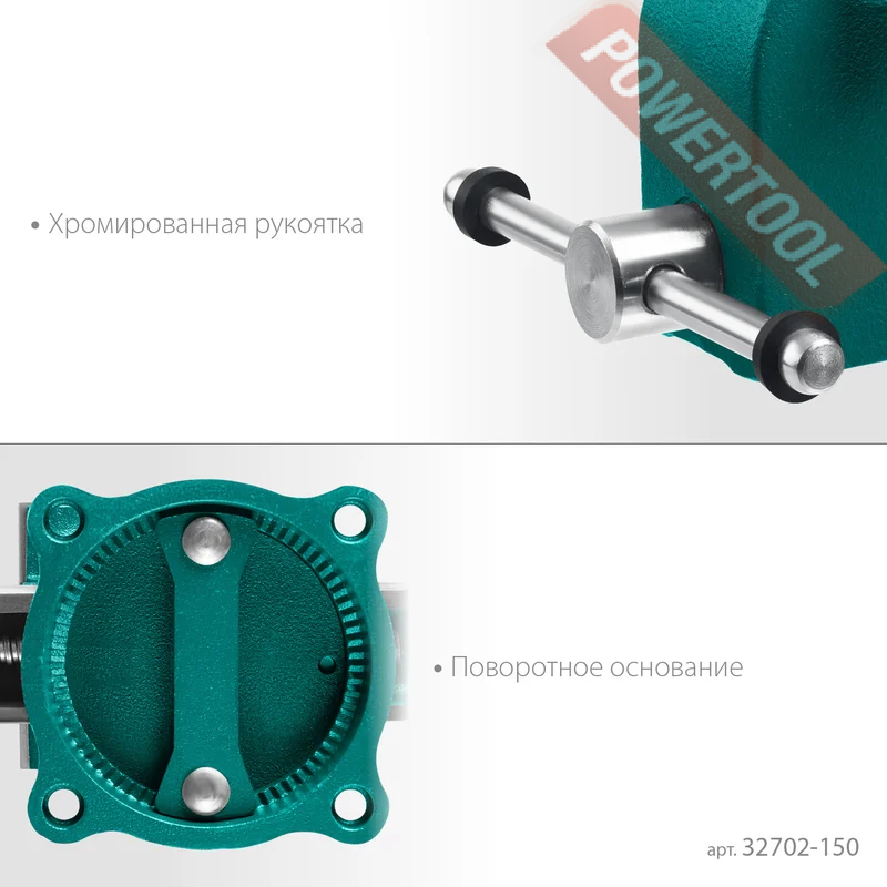 Тиски слесарные поворотные, ширина губок 150 мм, рабочий ход 150 мм, глубина зева 86 мм, наковальня, трубный зажим, функция поворота 360 градусов, размер ДхШхВ 415х176х216 мм, вес 19,5 кг.
