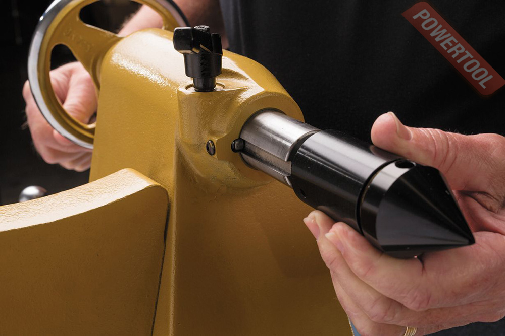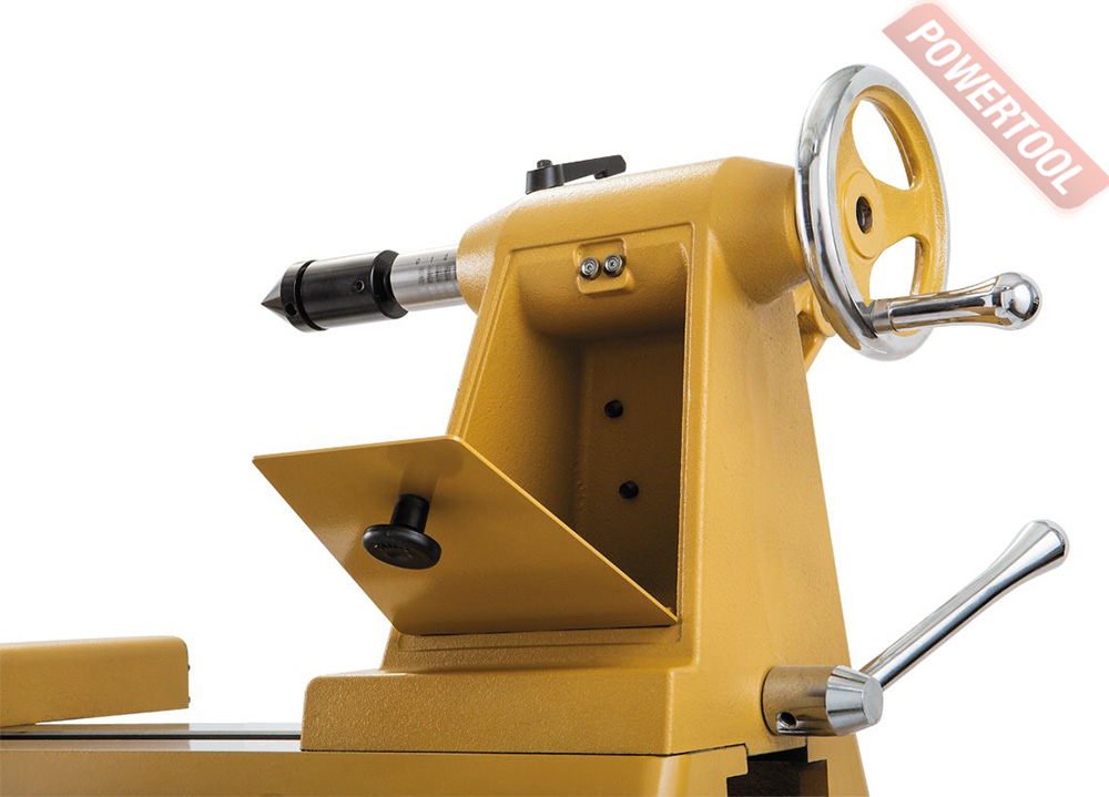 Для увеличения крутящего момента при обтачивании деталей большого диаметра можно переустановить ремень на шкивах. Натяжение производится рычагом с передней стороны бабки, который фиксируется винтовым зажимом с удобной ручкой. Есть делительное приспособление на 48 позиций и отдельный от него механизм блокировки шпинделя для удобства замены оснастки. Сама бабка подвижная вдоль станины и, кроме того, поворотная на 180° (это позволяет работать «над полом» с деталями, диаметр которых больше, чем просвет до станины). Задняя бабка с отсеком для хранения принадлежностей.