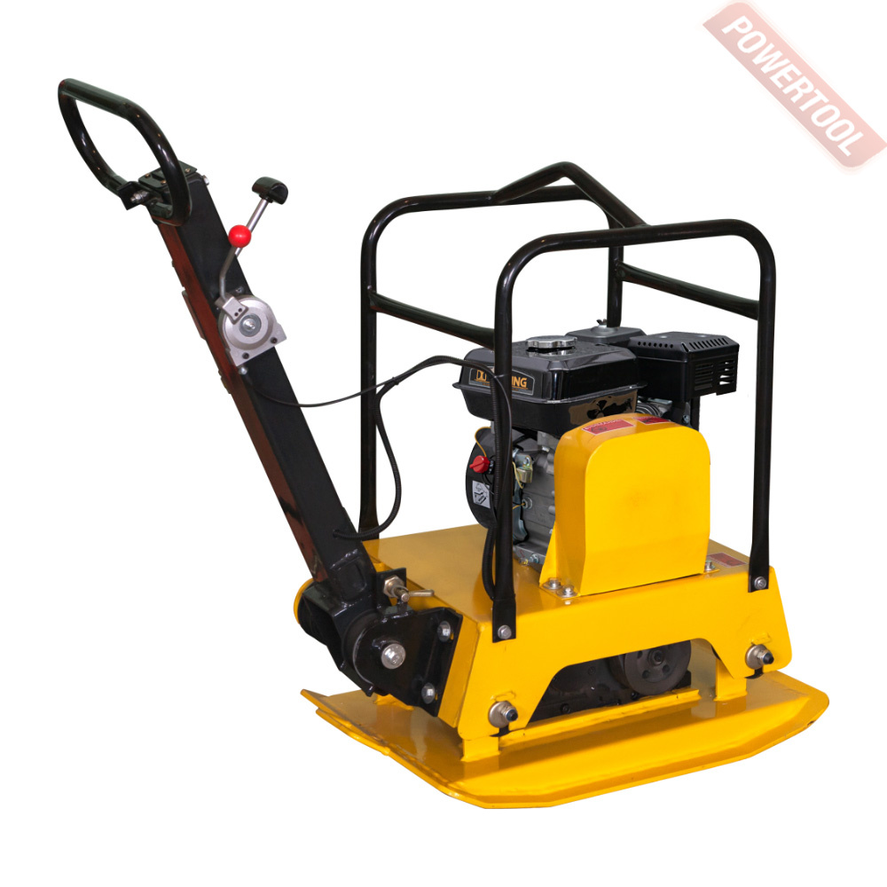 - Для удобства перемещения по строительной площадке виброплита имеет встроенные транспортировочные колеса, которые занимают мало места. Они уникальны. Достаточно просто поднять направляющую рукоятку, закрепить её и можно перемещать плиту.