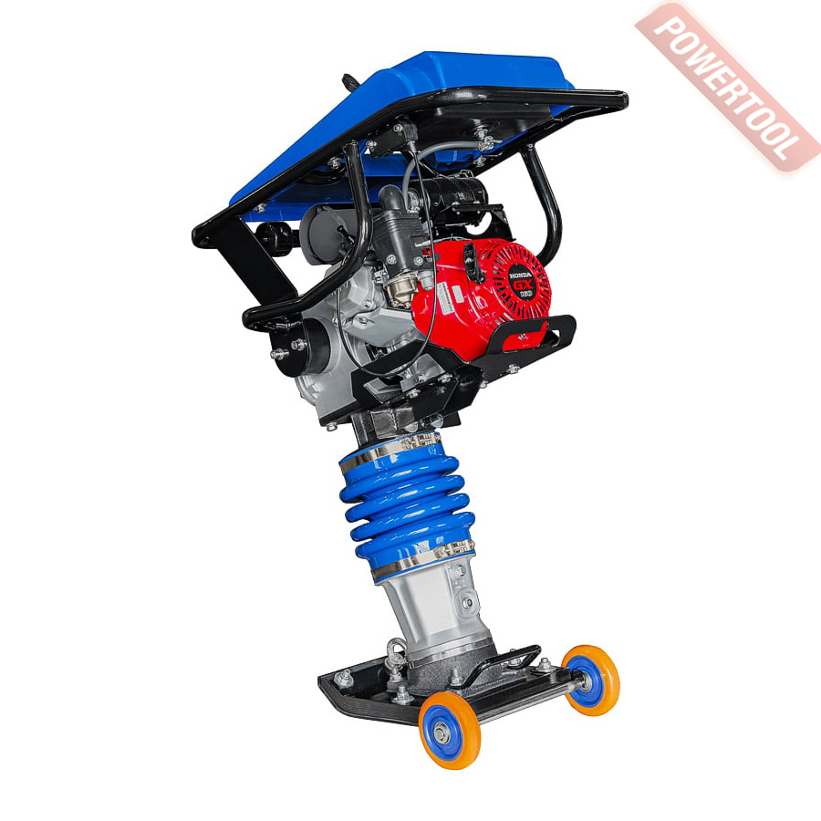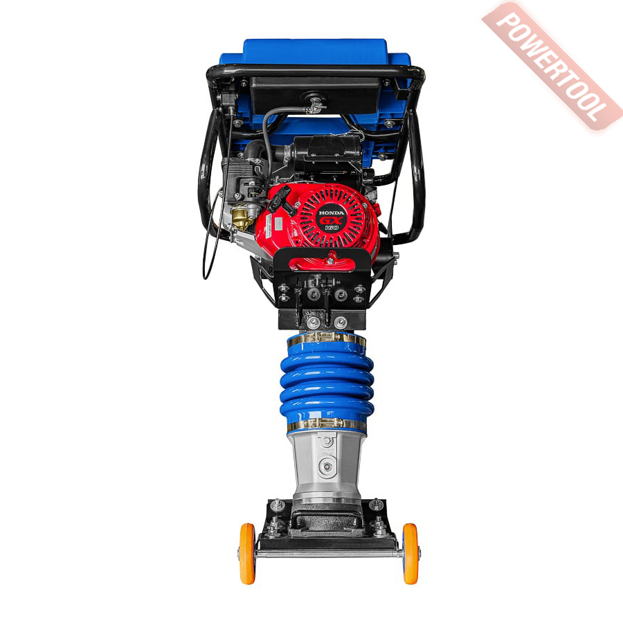 Вибротрамбовка бензиновая, вес 79 кг, размер подошвы 340х285 мм, усилие уплотнения 10 кН, частота ударов 450-650 уд/мин, глубина уплотнения 25-40 см, рабочая скорость 10-13 м/мин, производителность 222 кв.м/ч, 4-тактный бензиновый двигатель HONDA GX160 объемом 163 куб.см и мощностью 4,8 л.с., топливный бак 2,8 л, расход топлива 1,4 л/ч, емкость картера 0,6 л, габариты 770х420х1070 мм, колесный комплект.