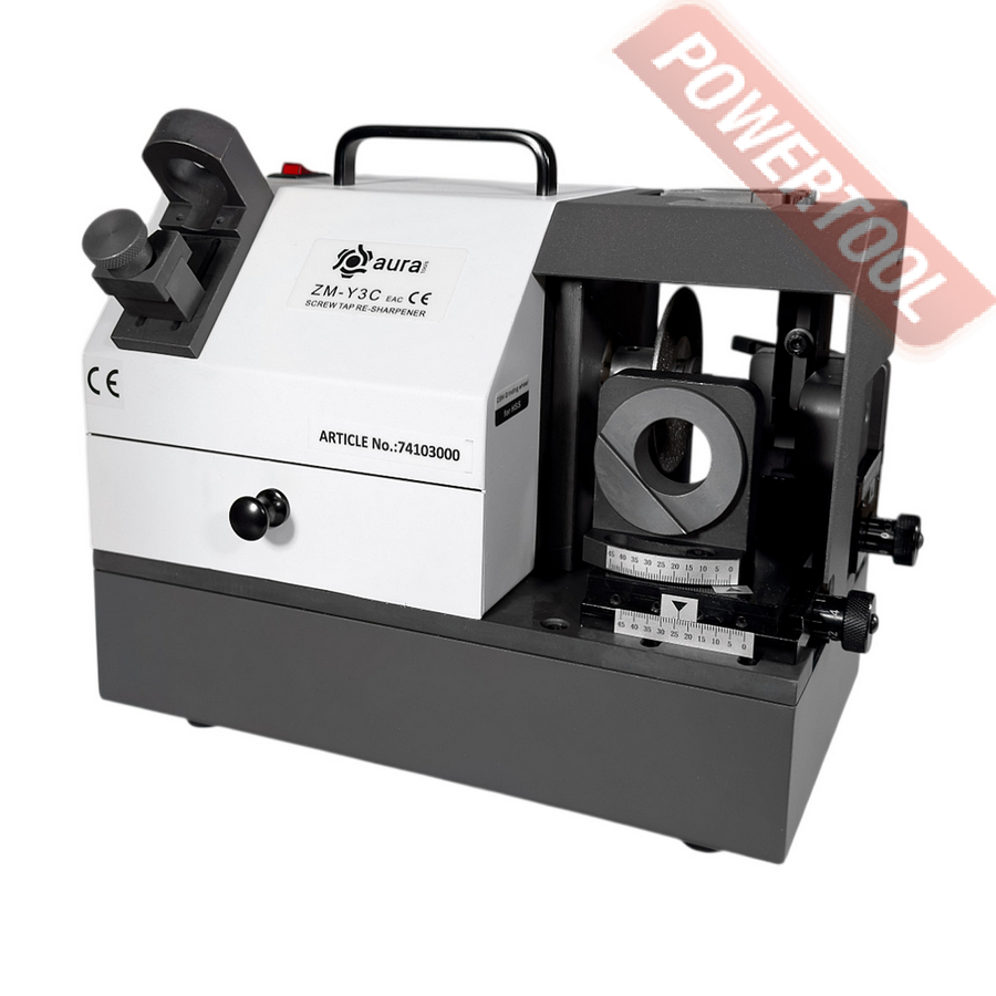 Заточной станок для заточки метчиков AURA TOOLS ZM-Y3C отличается простотой в эксплуатации, точностью и быстротой в использовании. Станок не требует высокой квалификации от пользователя. Заточка метчика занимает около 2-3 минут. Диск CBN для заточки метчиков из быстрорежущей стали входит в базовую комплектацию станка. Диск SDC для заточки твердосплавных метчиков предлагается как опция. Расчетная точность заточки 0,02 мм. Экономичный и мощный электрический двигатель, обеспечивает стабильную частоту вращения заточного диска. Двигатель рассчитан на длительный срок службы. Станок AURA ZM-Y3C позволяет произвести качественную заточку заходной части, торца и передних режущих кромок прямых метчиков, а так же заходной части и торца спиральных метчиков от М5 до М20 с 3 или 4-мя режущими кромками.